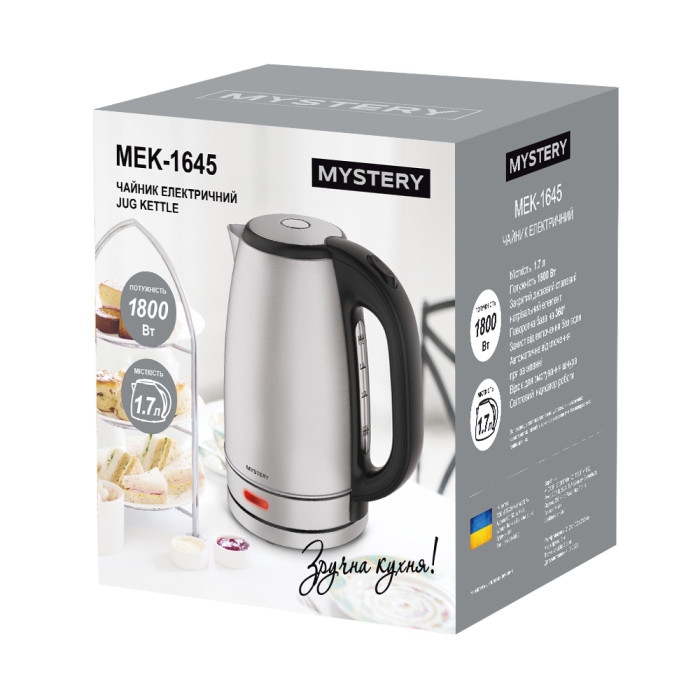 Компактний електрочайник MEK-1645 від американської компанії Mystery потужністю 2000 Вт, ємністю 1.7 літра, оснащується функцією автоматичного вимкнення під час закипання.
