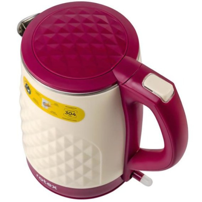 Елегантний корпус Rotex RKT55-R бежевого кольору з коричневими акцентами стане тією самою «родзинкою» інтер'єру, яка підкреслить шляхетні риси навколишнього оточення. Цікаве заломлення граней створює геометричний орнамент, фактура якого підкорить своїм шиком! Будова чайника адаптована для роботи з гарячою водою, тому внутрішня колба зроблена зі сталі. А зовнішні стінки із пластику завдяки технології Cool Touch якісно захищають вас від опіків, не передаючи своє тепло назовні. Колба не має швів, тому перебіг вмісту виключається. Кришка електричного чайника відкривається не руками - для її активації передбачена спеціальна кнопка, яка приводить в дію механізм, що піднімає.
