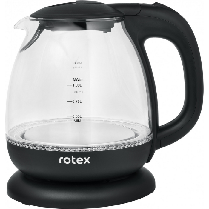 Живлення - 220-240В, 50Гц, потужність 1100Вт, ємність 1 л, закритий нагрівальний елемент з нержавіючої сталі, поворот на 360 градусів, автоматичне відключення при закипанні, захист від протікання, шкала рівня води, LED підсвічування, фільтр, що знімається, матеріал корпусу міцне термостійке скло, колір пластику: чорний.