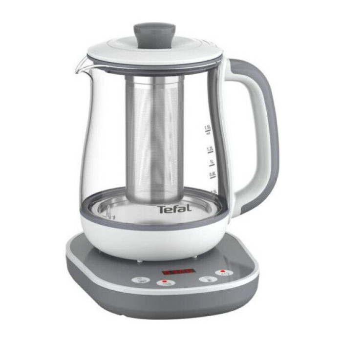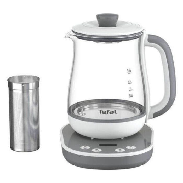 Tefal Tastea Tea Maker BJ551B10 є набагато більше, ніж просто пристрій для кип'ятіння води. Можливості моделі суттєво розширені. Особливо її переваги зможуть оцінити ті люди, які насолоджуються різними сортами чаю та прагнуть правильно їх заварювати. Чайник здатний не тільки кип'ятити воду, а й дотримуватися з аптечною точністю різних температурних режимів. Передбачено лише 8 програм, від 40 до 100 градусів. При цьому термостат ідеально дотримується заданих установок і забезпечить вашому напою ідеальний смак і аромат. Ви можете не тільки задати потрібну температуру, а й час наполягання чаю, щоб отримати правильний результат. Скляний корпус чайника Tefal Tastea Tea Maker BJ551B10 розташований на спеціальній основі з термоконтролером. Усередині чайника передбачено відсік для чаю або чайної суміші. Так ви зможете отримати ідеальний смак та насолодитися напоєм без травинок та чаїнок у рідині. Електронний блок керування доповнений екраном. А кнопки вибору режиму допоможуть швидко налаштувати програму роботи.