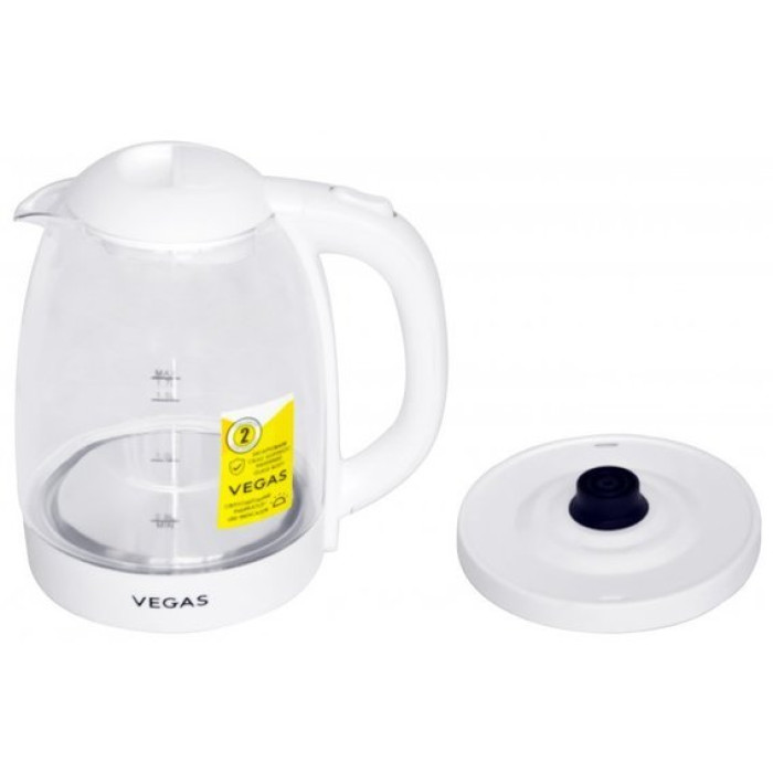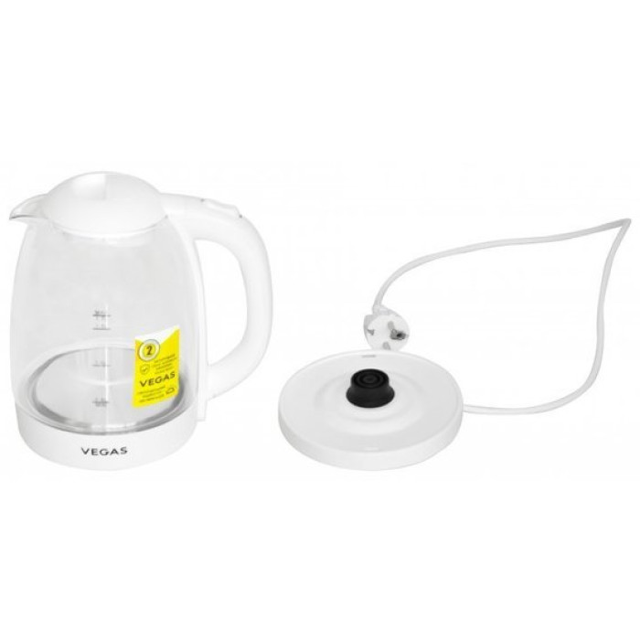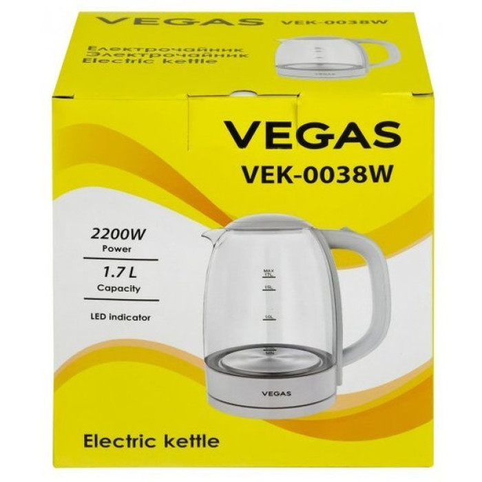 Корисний об'єм електрочайника VEGAS VEK-0038W: 1,7 л. Його цілком достатньо для задоволення потреб середньостатистичної сім'ї. Споживана потужність чайника дає змогу закип'ятити воду від трьох до п'яти хвилин. За типом нагрівального елемента модель належить до дискового (прихованого) типу. Перевагою дискового типу над спіральним є висока площа контакту з водою і швидкість її нагрівання. Трубчастий електричний нагрівач (ТЕН) розташований у днищі корпусу.