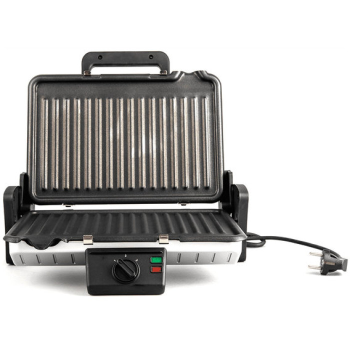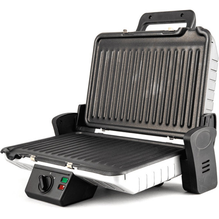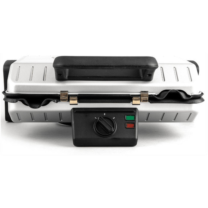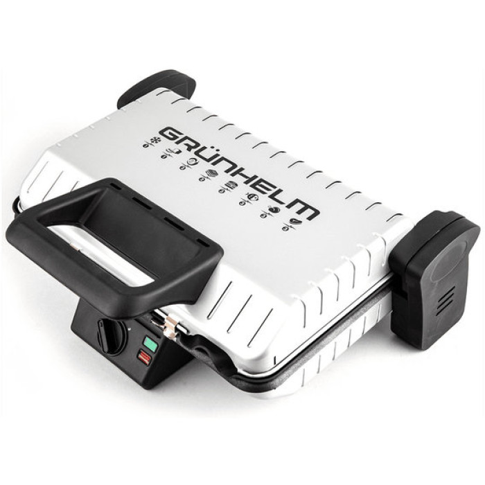 Контактний гриль GRUNHELM G1622 потужністю 1,6 кВт швидко нагрівається до температури 260°С. Дві знімні панелі рельєфної форми мають антипригарне покриття, верхня частина рухається на шарнірах та регулюється по висоті. Можна зафіксувати два положення відкриття. Для візуальної зручності є індикатори включення та готовності. При необхідності гриль можна зберігати у вертикальному положенні. Довговічний корпус виконаний з нержавіючої сталі та пластику. Керується пристрій механічно, що робить його надійним та довговічним.