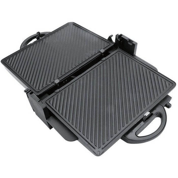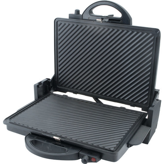 Контактний гриль Maestro MR-717 поєднує у собі всі переваги відкритого та контактного (притискного) гриля. Він призначений для приготування найрізноманітніших видів м'яса, курки-гриль, риби, морепродуктів, сосисок, овочів, сендвічів паніні та ін. Ціна контактного гриля доступна для бюджету будь-якої середньої родини. Для зручності перенесення та зберігання гриля у вертикальному положенні передбачені теплоізольовані ручки та замок-фіксатор.
