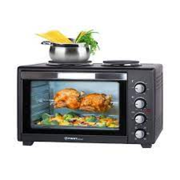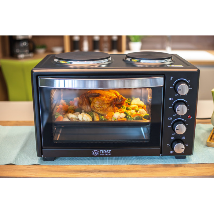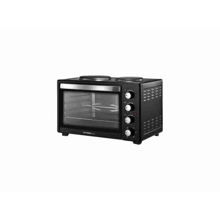 Черная электропечь First FA-5045-4 станет верной помощницей на вашей кухне. Она прекрасно подходит для использования в малогабаритных помещениях. Эта модель объединила в своем корпусе духовой шкаф и плиту. С ее помощью можно оперативно приготовить любые блюда. Электропечка First FA-5045-4 оборудована двумя чугунными конфорками. Диаметры у них – 185 и 155 мм. Управление происходит с помощью поворотных регуляторов. Они крайне удобны в использовании, можно оперативно выставлять все параметры.