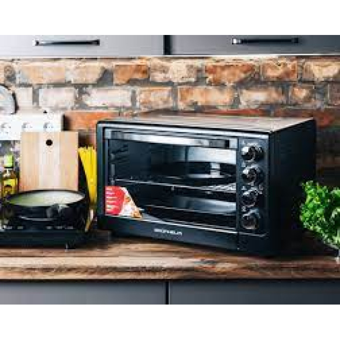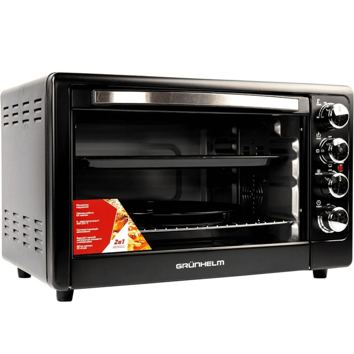 Печь электрическая Grunhelm GN50ARC, имея компактные размеры и небольшую вместительность 50 л, отлично справляется со всеми основными функциями: в ней можно печь пироги, торты, кекс, запекать мясо, овощи, готовить жаркое, а также размораживать продукты.