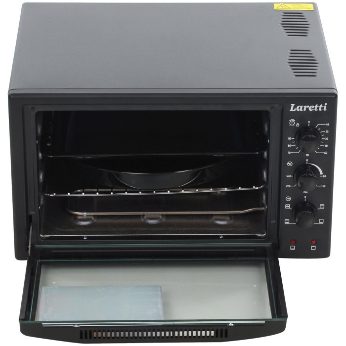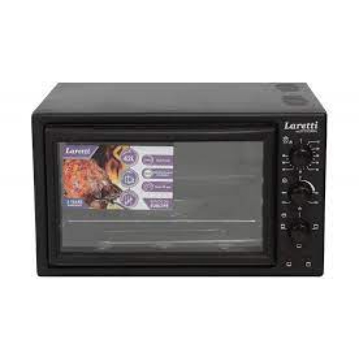 Электрическая печь средних размеров (42л), мощностью 1500 Вт с антипригарным внутренним покрытием и дверцей из двойного стекла.