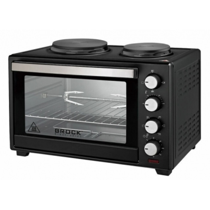 Електродуховка з електричною плиткою, 2 конфорки (1000 Вт/600 Вт), загальна потужність 3600 Вт, потужність духовки 2000 Вт, об'єм 60 л, механічне керування, конвекція, вертлюг, 4 регулятори потужності, внутрішнє підсвічування, подвійне скло дверцят, . сталі, форма для запікання, грати, ручка для дека.