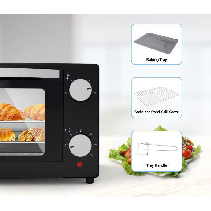 Духовка електрична, потужність 650 Вт, об'єм 9 л, механічне керування, таймер 60 хв з будильником, термостат 100-230ºС, внутрішнє підсвічування, подвійне скло, в комплекті: грати, піддон для запікання, ручка ля піддону