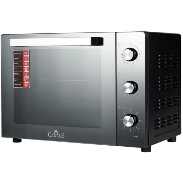 Електродуховка Castle CPE-60 має вбудований термостат, що регулюється, який допомагає виставляти температуру в межах від 70 до 250 С. Внутрішній об'єм електродуховки, фактично задіяний під час приготування їжі, становить 60 л. Управління електродуховкою відбувається шляхом прихованих регуляторів. У печі вбудовано таймер, що є індикатором під час приготування. Таким чином, після заданого часу електродуховка автоматично вимикається, що не дозволяє згоріти вашій страві. У комплектації до духової печі йде лоток для крихт, грати, форма для випікання та ручка для неї.