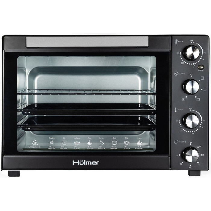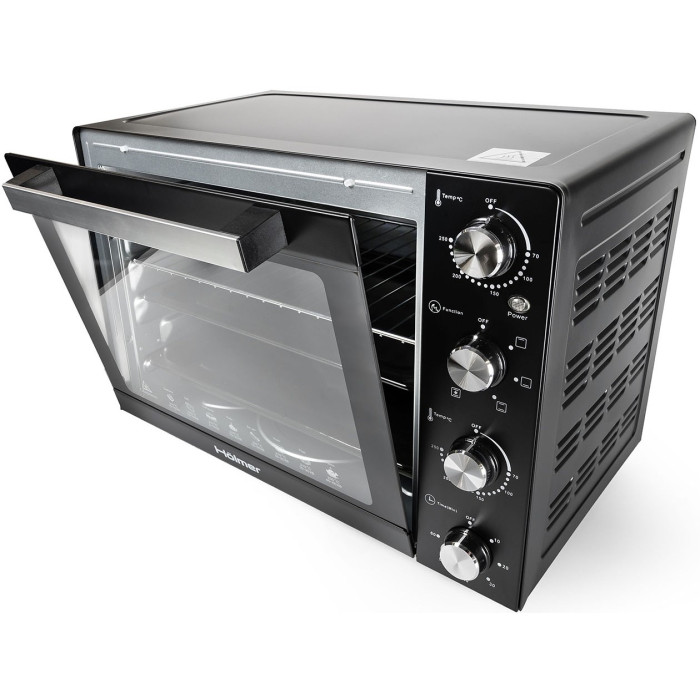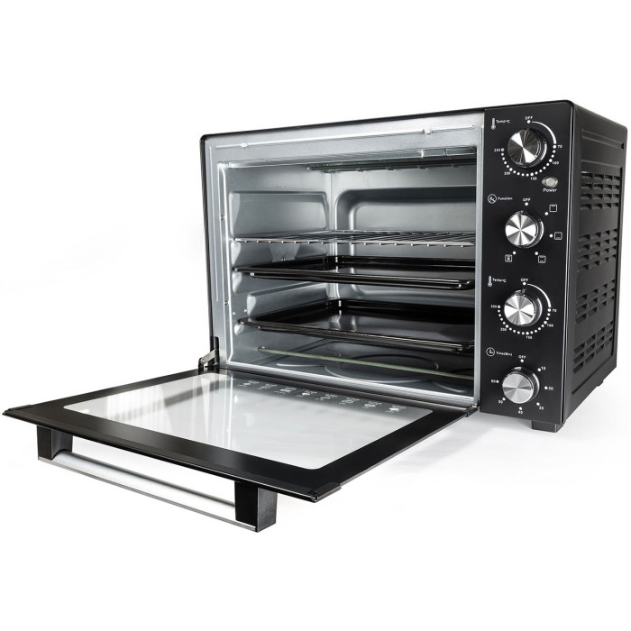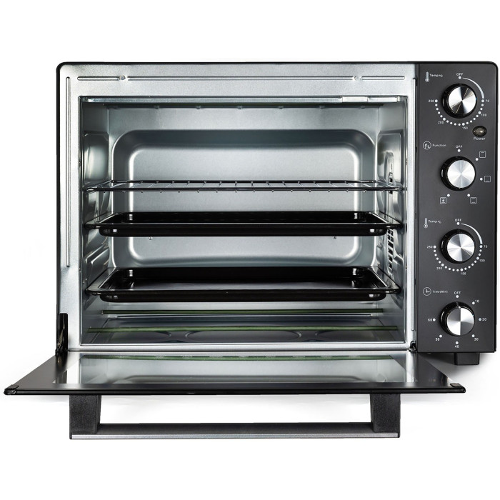 Нагрівальні елементи із нержавіючої сталі. Звуковий сигнал. Світловий індикатор роботи. Комплектація: електрична піч, деко з антипригарним покриттям: 2 шт, грати гриль, ручка знімна для дека та решітки