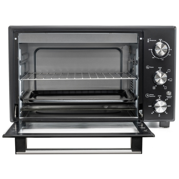 Чорний корпус із комбінації сталі, скла та пластику забезпечує міцність і елегантний зовнішній вигляд. Піч також обладнана внутрішнім підсвічуванням і світловим індикатором роботи, що полегшує контроль за процесом приготування. Нагрівальні елементи з нержавіючої сталі гарантують довговічність та рівномірний розподіл тепла.