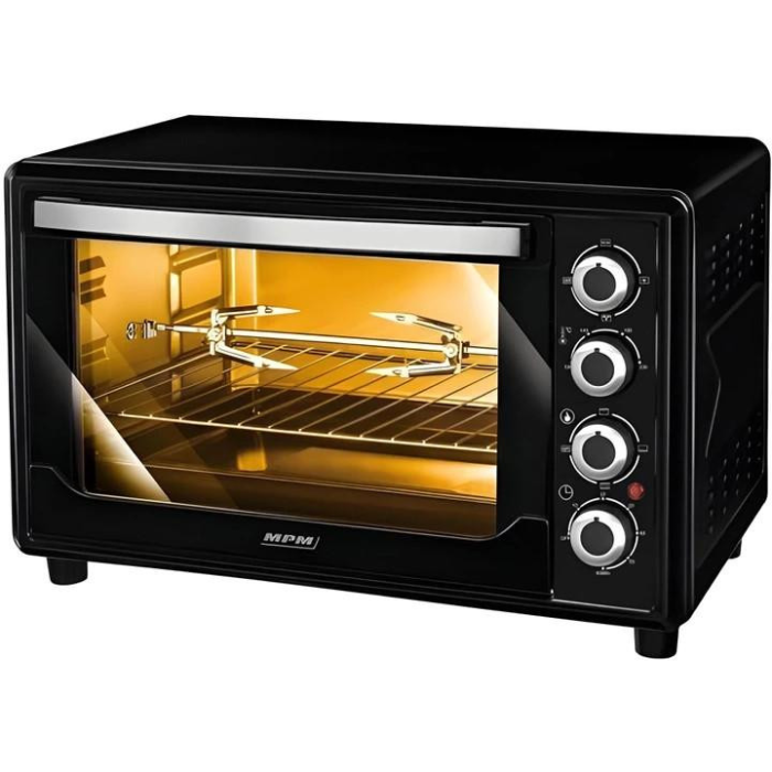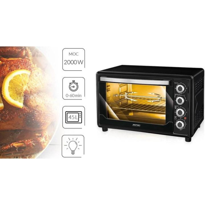 Велика та надійна електродуховка MPM Product MPE-07/T допоможе швидко приготувати великі обсяги їжі. Завдяки наявності вентилятора і 3 режимам нагріву ваша випічка матиме гарний золотистий колір, не підгорить і рівномірно пропечеться, а термоізоляція і дверцята з подвійного скла зведуть до мінімуму тепловтрату. Рожен і решітка, що повільно обертається, дадуть змогу внести у ваш раціон меню гриль, м'ясо або курка вийдуть соковитими з хрусткою скоринкою, а зайвий жир стече на деко. Дуже просте механічне управління дає змогу вибрати потрібну температуру, виставити потрібний для приготування час і режим нагріву. До духовки MPM Product MPE-07/T від польського виробника також додаються: шампур і решітка для гриля, велике деко, ручки. Її можна розташувати на будь-якій поверхні, адже ніжки мають покриття, що не дає змоги їй зісковзнути.
