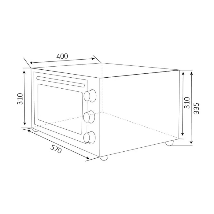Електропіч об'ємом 45 л виконана із пофарбованої емалі. Оснащена механічним керуванням, таймером до 90 хвилин і трьома режимами нагріву: верхнім та нижнім, тільки верхнім або лише нижнім. Максимальна температура досягає 250 °С, споживана потужність становить 1500 Вт, клас енергоспоживання – А. У дверцятах встановлено одне широке термостійке скло з металевим захисним кріпленням.