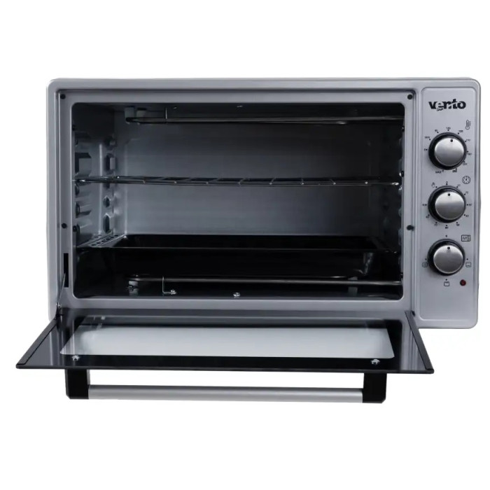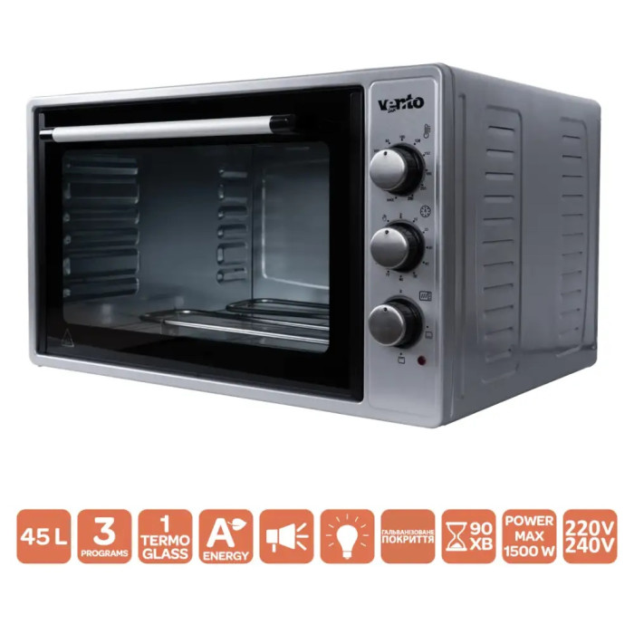 Електропіч об'ємом 45 л виконана із пофарбованої емалі. Оснащена механічним керуванням, таймером до 90 хвилин і трьома режимами нагріву: верхнім та нижнім, тільки верхнім або лише нижнім. Максимальна температура досягає 250 °С, споживана потужність становить 1500 Вт, клас енергоспоживання – А. У дверцятах встановлено одне широке термостійке скло з металевим захисним кріпленням.