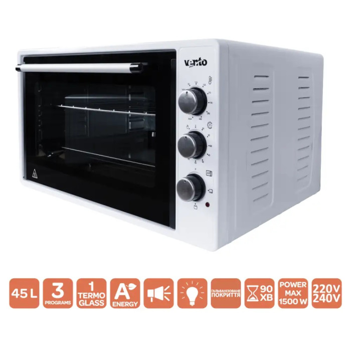 Електропіч об'ємом 45 л виконана із пофарбованої емалі. Оснащена механічним керуванням, таймером до 90 хвилин і трьома режимами нагріву: верхнім та нижнім, тільки верхнім або лише нижнім. Максимальна температура досягає 250 °С, споживана потужність становить 1500 Вт, клас енергоспоживання – А. У дверцятах встановлено одне широке термостійке скло з металевим захисним кріпленням.