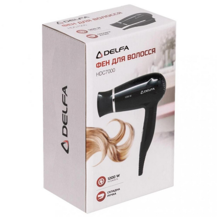Ідеально підійде для сушіння та укладання волосся. Його потужність складає 1200 Вт, а корпус створений із термостійкого пластику. Ергономічна ручка з кнопками управління зручно поміщається у долоні. Як основна насадка служить концентратор, який дозволяє направляти струмінь повітря на конкретну ділянку волосся. Фен Delfa HDС7000 дозволяє використовувати 2 температурні режими і 2 режими швидкості потоку. Ці опції допоможуть виставити температуру повітряного потоку, що найбільше підходить саме для Вашого типу волосся, і убезпечать їх від перегріву.