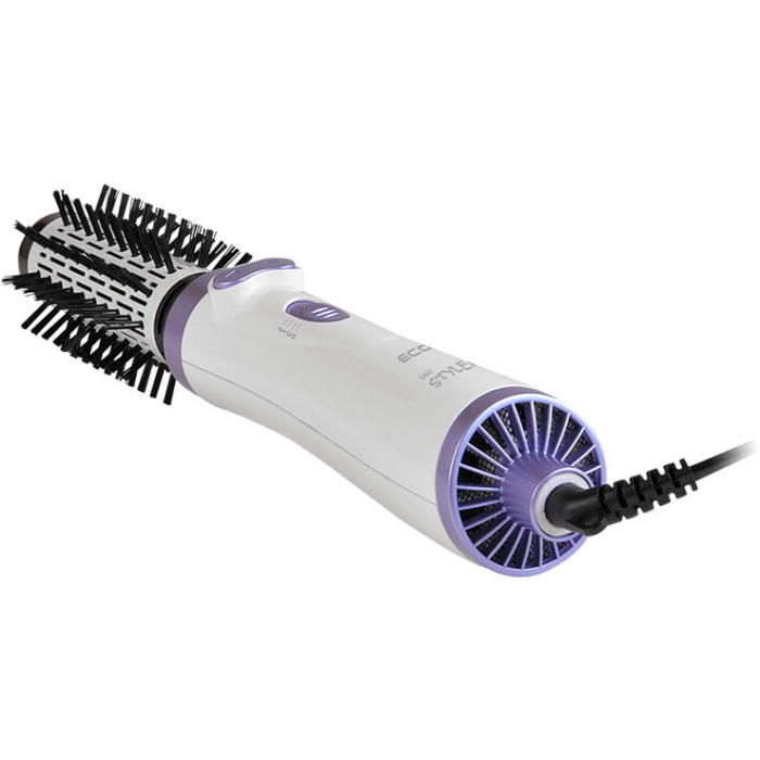 Фен-щітка ECG HK 130 виробляється в ергономічному пластмасовому корпусі в біло-фіолетових кольорах. Пристрій потужністю 800 Вт обладнано мотором, що працює на двох швидкостях і має функцію зворотного обертання. Нагрівання повітряного потоку виконується на двох рівнях температури, а для надійної фіксації зачіски слід застосовувати подачу холодного повітря. Модель має функцію іонізації, негативні іони якої нейтралізують статичний заряд, надаючи волоссю блиску та м'якості. Прилад комплектується двома насадками-щітками, за допомогою яких можна створювати бажану зачіску. Безпека фен-щітки ECG HK 130 забезпечується системою автоматичного вимкнення при перегріві. Пристрій підключається до мережі шнуром живлення, що обертається, довжиною 180 см, а зберігається в підвішеному за спеціальну петлю положенні.