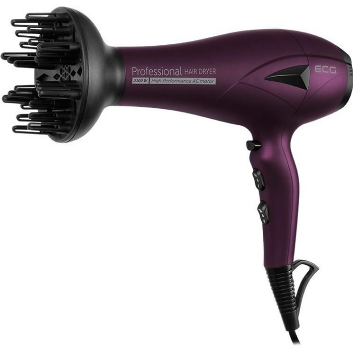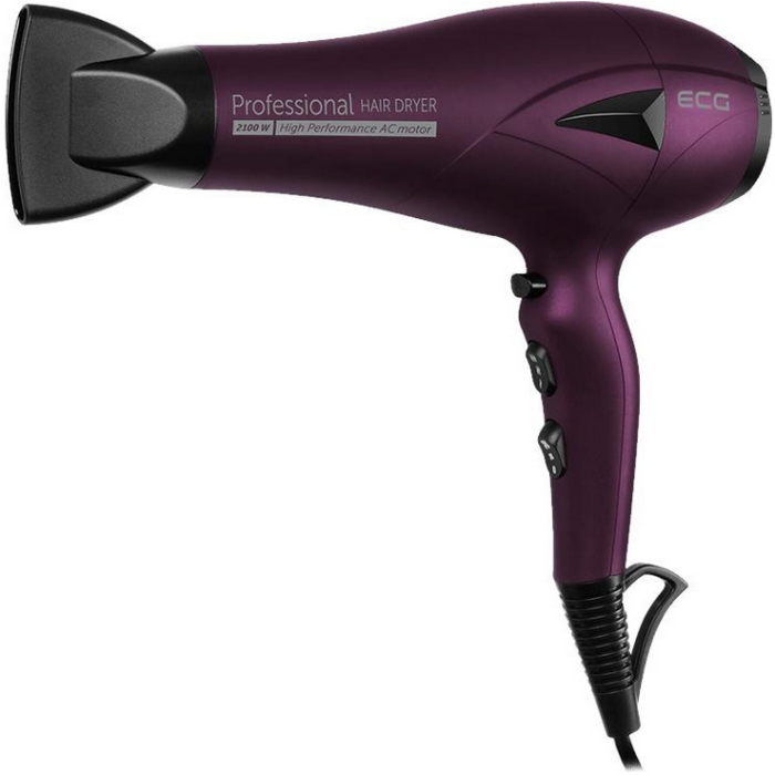Фен ECG VV 3121 Professional у пурпуровому кольорі, зробить процес укладання волосся максимально комфортним та ефективним. Фен має потужність 2100 Вт і повітряне обдування, завдяки чому Ви зможете швидко висушити волосся. Зафіксувати укладання допоможе функція подачі холодного повітря. У комплект входять дві насадки: концентратор та дифузор. Крім цього, фен ECG VV 3121 Professional має захист від перегріву, три температурні рівні та два рівні швидкостей.