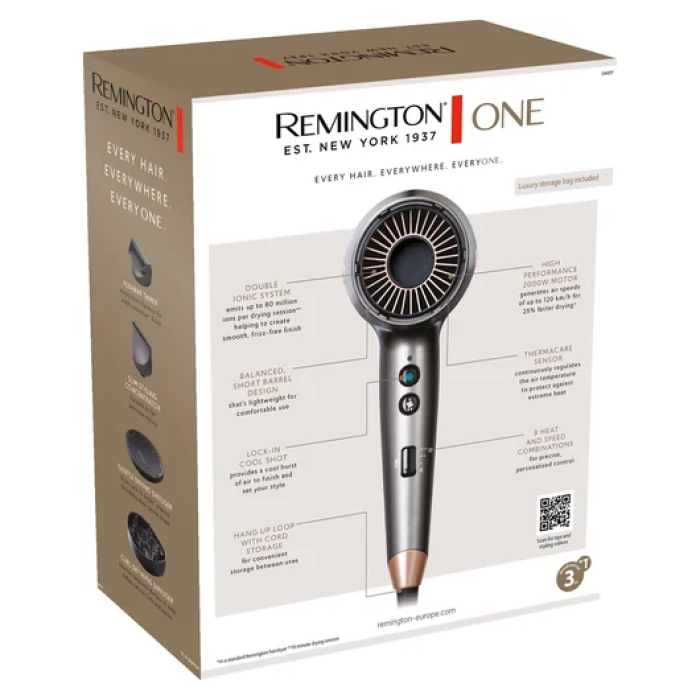 Невелика вага та компактні розміри фена Remington One дозволяють краще контролювати укладання. Незалежно від того, чи укладаєте ви волосся за допомогою концентратора та щітки або підкреслюєте завиток локонів, сушити волосся навіть протягом тривалого часу буде зручно та комфортно.