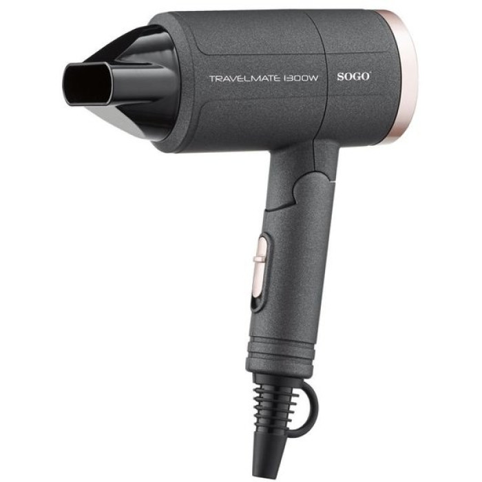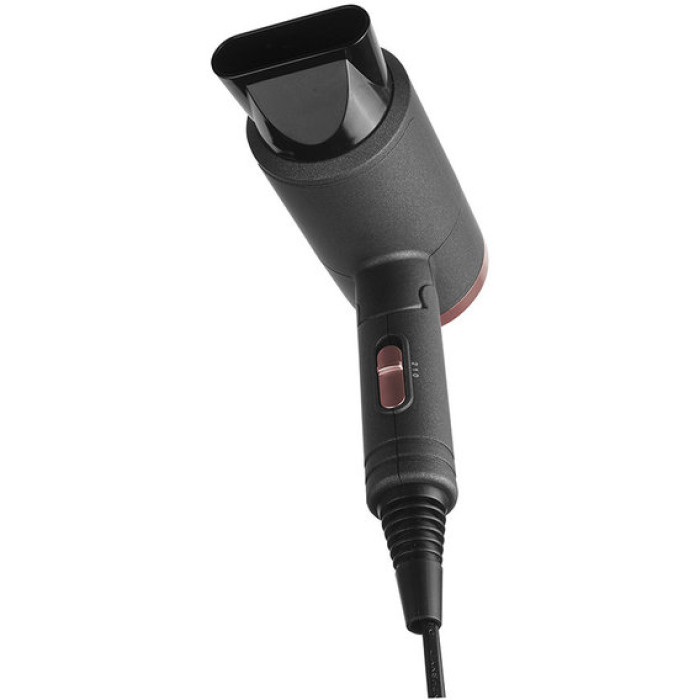 Перед вами функціональний пристрій, орієнтований на дорожнє використання. Показника потужністю 1200 Вт цілком достатньо для забезпечення якісного потоку гарячого повітря. Габарити пристрою значно зменшуються, якщо скласти ручку. Ця частина фена має трансформовану конструкцію, що дає змогу легко перетворювати фен із робочого стану в компактну форму для зберігання. Простий інтерфейс управління реалізовано кнопками, розташованими на рукояті. Вони допомагають задати один з 2 режимів швидкості, а також вибрати один з 2 температурних варіантів. На захисному ковпачку зроблена зручна підвісна петля. Вона акуратна і міцна, має достатній для підвішування на гак діаметр отвору.