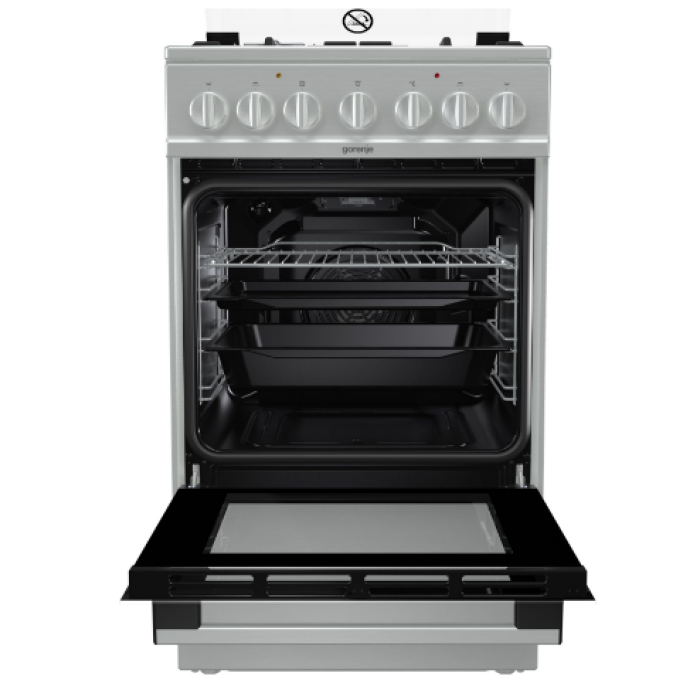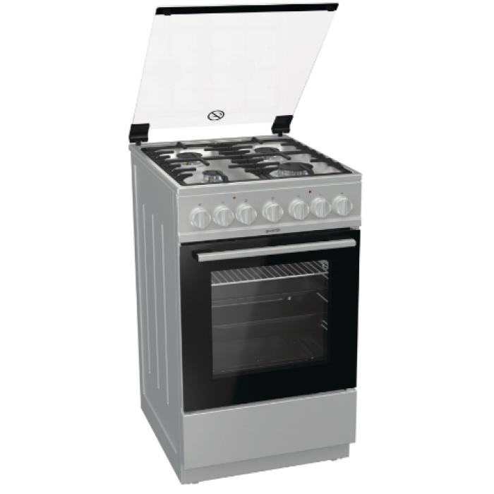GORENJE K 5241 XF - газовая панель + электрический духовой шкаф, газ-контроль конфорок, поверхность: эмалированная сталь, крышка из закалённого стекла, энергопотребление A, управление механическое, таймер механический, размеры (ШхГхВ): 50x59.4x85 см, цвет серебристый