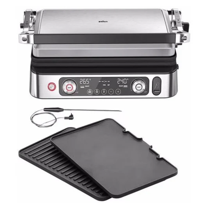 Насолоджуйтесь результатами професійного рівня та точністю на сніданок, обід, вечерю та перекушування. Відчуйте необмежену універсальність завдяки двом різним плитам та трьом положенням приготування на найбільшій варильній поверхні Braun. Вам сподобається швидкість та ефективність потужності 2200 Вт завдяки вбудованим нагрівальним елементам для більш швидкого приготування та точність вбудованого термозонду. А якщо ви серйозно ставитеся до підсмажування, кнопка «Sear» нагріває гриль до 265 ° C, щоб утворилася насичена коричнева скоринка, яка посилює смак будь-якого шматка м'яса.