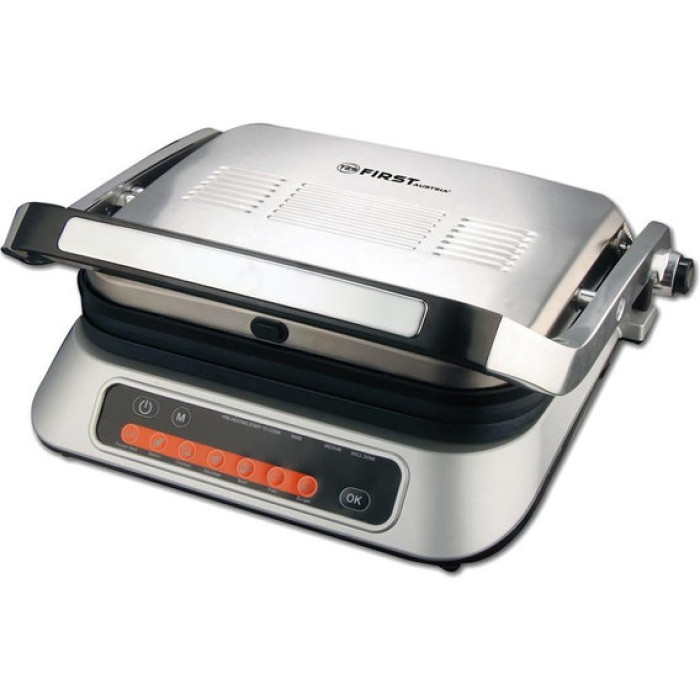 Рифлена поверхня пластин. 7 вбудованих програм: розморожування, приготування гамбургерів, бекону, сосисок, риби, курки, яловичини. При приготуванні на запрограмованому режимі, визначення товщини продукту і вибір рівня нагрівання відбуваються автоматично. Під час роботи гриля на дисплеї відображається індикація нагріву, обраного режиму, рівня прожарювання (готовності). Гриль відкривається на 180 °, що дозволяє готувати більше продуктів одночасно. Для легкого догляду, прилад оснащений знімними, миються, жароміцних пластинами з антипригарним покриттям. Температурний режим регульований до 250 ° C. Індикатори нагріву, роботи. Ручка з захистом від нагрівання.