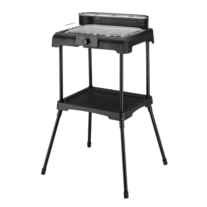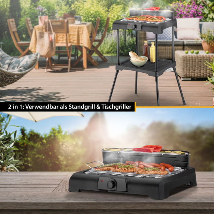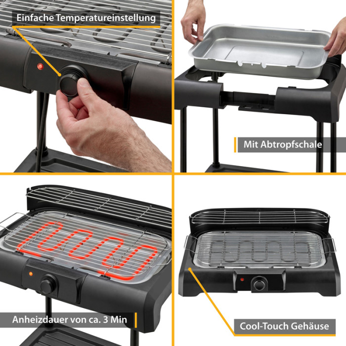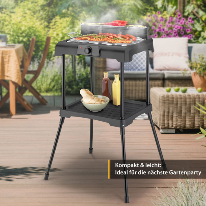 Для використання як настільний барбекю просто зніміть його з рами. Барбекю потужністю 2200 Вт пропонує корисні додаткові функції: місце для зберігання в рамі, мобільні та регульовані по висоті сталеві ґрати з теплоізольованими ручками, піддон для збору масла, безступінчасте регулювання температури, вітрозахист та запобіжний вимикач.