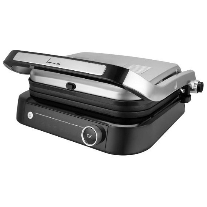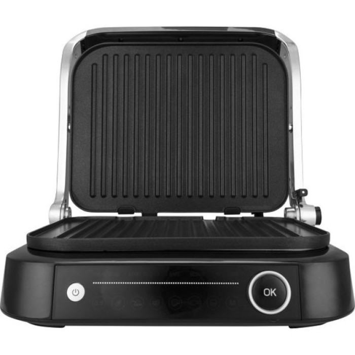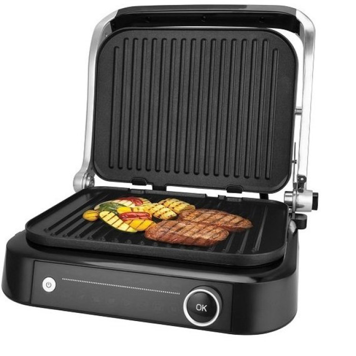 Потужність: 1800-2100Вт, відкриття 180˚, знімні пластини, 7 встановлених програм + ручне управління, світлодіодний дисплей з індикаторами стадій приготування - попередній нагрівання, прожарювання, середнє прожарювання, датчики визначення товщини, регульована температура.