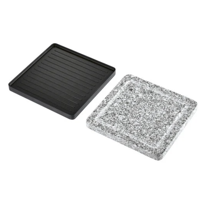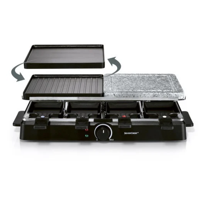Silver Crest SRGS 1400 E1 гриль - раклетниця для приготування овочів, м'яса та риби. Обертова пластина для гриля з литого алюмінію під тиском з високоякісним антипригарним покриттям ILAG® Corflon Ultra. Цю пластину можна мити в посудомийній машині. Плита з натурального каменю з жолобком для збирання соку та жиру, підходить також для випікання. Регульований контроль температури. Нагрівальний елемент та тепловідбивач з нержавіючої сталі У комплект входять 8 дек з антипригарним покриттям та пластикові скребки, які можна мити в посудомийній машині.