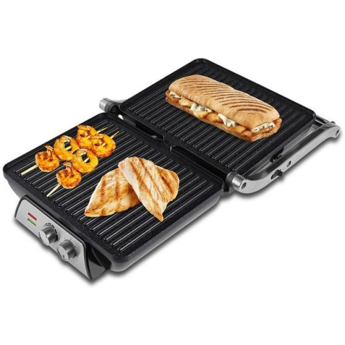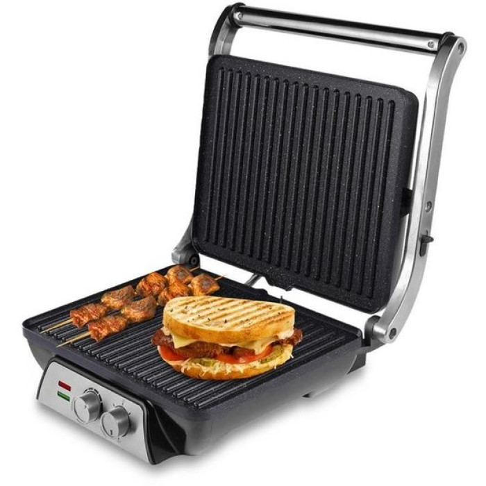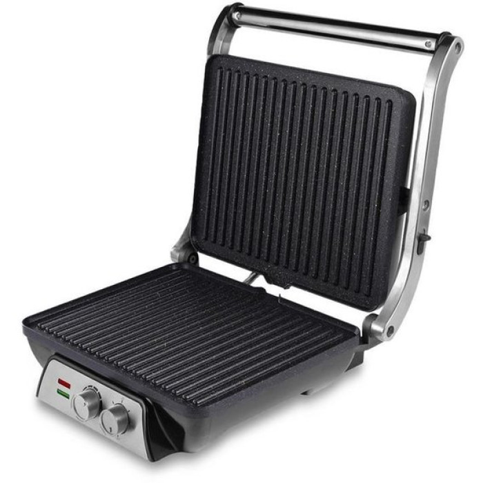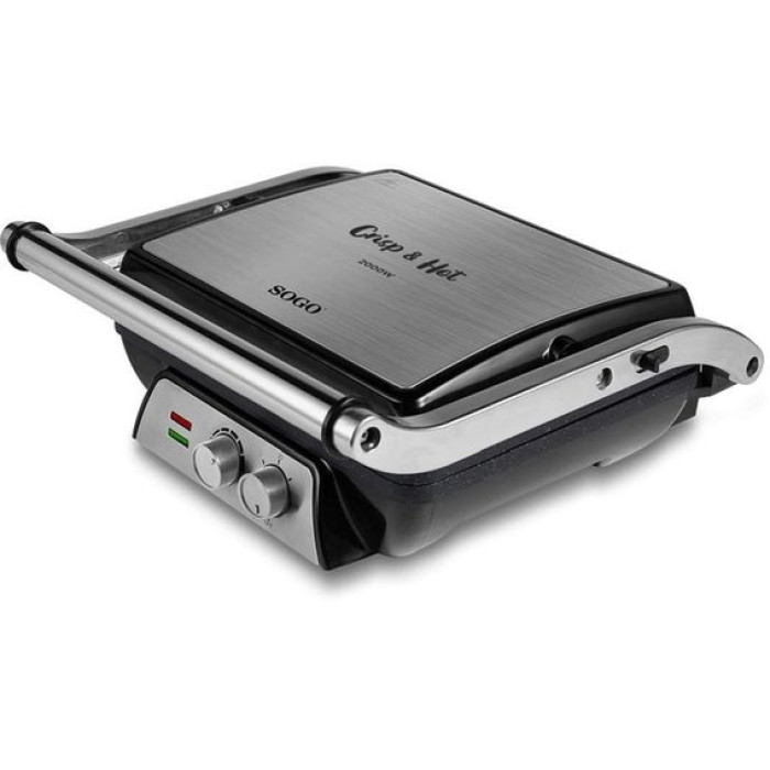 Електрогриль SOGO SAN-SS-7137, корпус якого виготовлений із сталі та термостійкого пластику, оснащений механічним керуванням режимами роботи термостату. Прилад вмикається поворотом дискового терморегулятора. Потужний пристрій оперативно та рівномірно нагріває верхню та нижню смажені сталеві пластини, впритул до яких встановлені ТЕНи. Таке конструкційне рішення забезпечує енергоефективне споживання електрики та швидке приготування їжі. За допомогою моделі можна запікати рибу, овочі, м'ясо з скоринкою, що зберігає соковитість інгредієнтів, готувати закриті бутерброди. Безпеку експлуатації підтримує термоізольована ручка. Прилад обладнаний індикаторами включення та готовності, також є механічний таймер на 30 хвилин.
