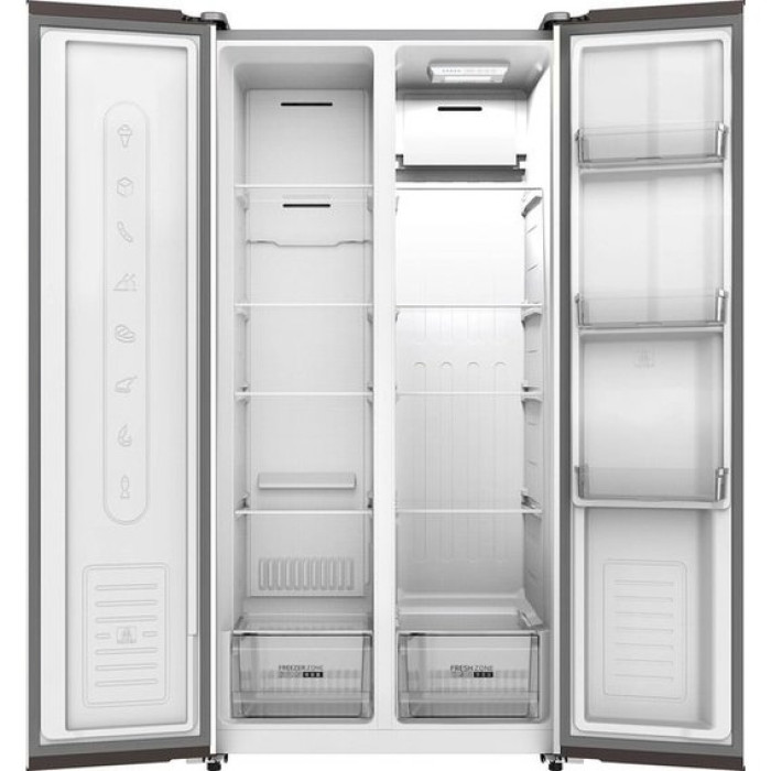 Для вашого комфорту та зручності, морозильна камера розташована збоку, а ручки холодильника приховані та вертикальні, що створює сучасний та елегантний вигляд. Крім того, рівень шуму складає всього 42 дБ, що робить цей холодильник особливо тихим у роботі.