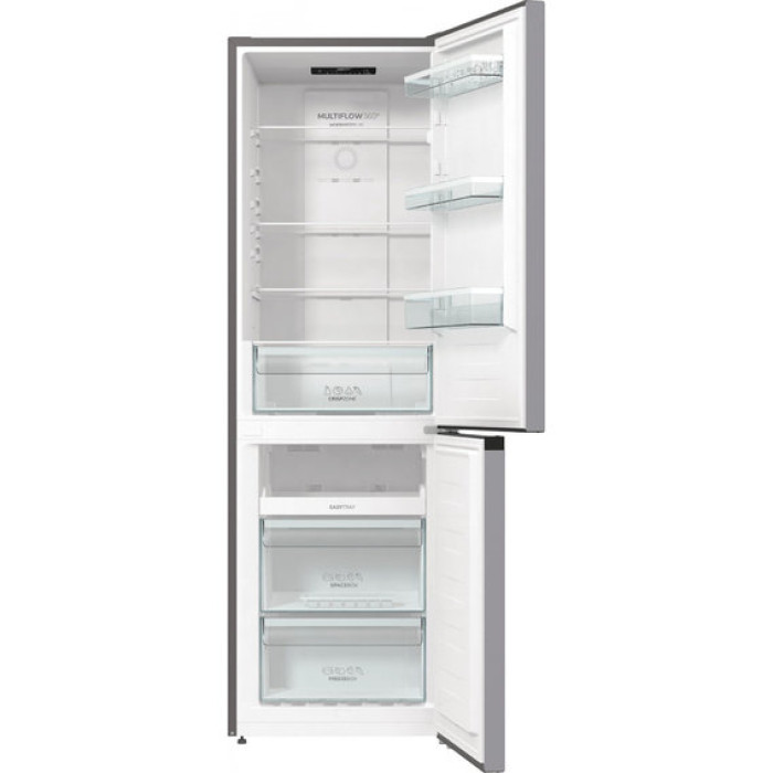 Холодильник з морозильною камерою Gorenje NRK6191PS4 – окремий дводверний прилад з інтегрованою горизонтальною ручкою. Він виконаний у стильному кольорі нержавіючої сталі. Схема охолодження агрегату містить один контур, що охолоджується, і поршневий компресор, що працює з низьким рівнем шуму - до 38 дБ. Модель класу енергоспоживання А+ управляється електронними кнопками із внутрішнім цифровим дисплеєм. Холодильна камера об'ємом 203 літри обладнана багатопотоковою системою охолодження MultiFlow 3600 та технологією AdaptTech, що стежить за сталістю заданої температури. У ній розташовані 4 скляні полиці та контейнер для овочів та фруктів CrispZone. Нижнє морозильне відділення ємністю 99 літрів швидко заморожує продукти за допомогою функції FastFreeze, що зберігає корисні властивості їжі. Обидві камери холодильника Gorenje NRK6191PS4 оснащені системою розморожування No Frost, що запобігає утворенню льоду та інею.