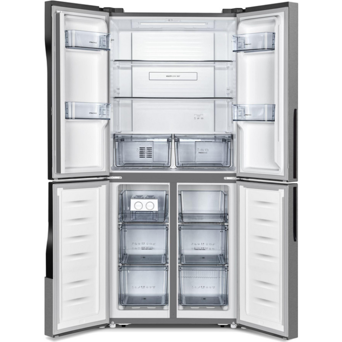 Холодильник з морозильною камерою Gorenje NRM8181MX - окремий прилад, виконаний в елегантному сучасному дизайні в кольорі нержавіючої сталі. Чотиридверна модель, класу енергоспоживання А+, виготовлена у конструкції з нижнім розташуванням морозильної камери. Вона виконана за одноконтурною схемою охолодження та обладнана одним інверторним компресором, рівень шуму якого під час роботи не перевищує 42 дБ. Корисний об'єм холодильної камери складає 265 літрів. Завдяки функції інтенсивного охолодження SuperCool та багатопотоковій системі MultiFlow 360 забезпечується тривале та якісне зберігання продуктів. Слід зазначити ексклюзивні умови для збереження всіх корисних властивостей овочів та фруктів у спеціальному контейнері FreshZone та контейнері CrispZone з контролем вологості HumidityControl. Місткість морозильного відділення з функцією швидкого заморожування – 129 літрів. У ньому їжа розміщується у шести містких прозорих висувних ящиках. Також відділення містить льодогенератор з поворотним механізмом. Холодильник з морозильною камерою Gorenje NRM8181MX керується електронними кнопками, а охолодження обох камер здійснюється системою Total No Frost.