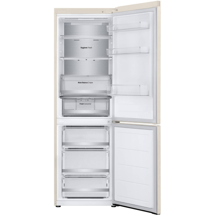 Металева пластина на задній стінці є додатковим джерелом охолодження. Технологія DoorCooling+: вентиляційні отвори на передній панелі холодильника допомагають підтримувати потрібну температуру, щоб продукти залишалися свіжими. Удосконалена складана полиця тепер має два етапи складання. У рамках технології Hygiene Fresh+ від LG використовується 5-етапний фільтр, що усуває більшість причин псування їжі: пил, грибкові суперечки, кислий, лужний запах та бактерії.