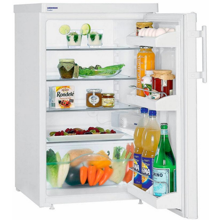 Однокамерний компактний холодильник Liebherr T 1410 – ідеальний варіант для невеликої кухні. У мініатюрному холодильнику є все, що потрібно для правильного, тривалого зберігання продуктів. При своїх компактних зовнішніх параметрах холодильник T 1410 має достатню місткість. Загальний об'єм T 1410 становить 138 літрів при глибині 62 см. Корисного простору в малогабаритному холодильнику Liebherr більше, ніж достатньо. Наважка дверей права, змінна. Регулювання температури здійснюється вручну за допомогою механічного поворотного вимикача. Конструктивні особливості окремого Liebherr T 1410 дозволяють встановити холодильник впритул до стіни або вбудувати в нішу.