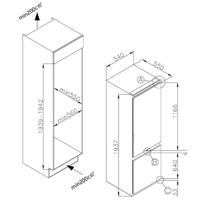 Завдяки вбудуванню холодильника у меблі, він не буде вибиватись із загального дизайну приміщення, при цьому, ви зможете зекономити місце на кухні. Висота моделі 193 см, а це значить, що для зберігання продуктів доступно: три полиці для продуктів, кошик для овочів, 4 полиці на дверці холодильника, дві корзини в морозильній камері та відділення для льоду.