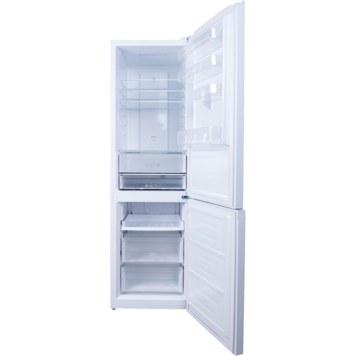 Полиці холодильної камери (матеріал/к-во) загартоване скло / 3 шт, що переставляються, дверні кошики (4 шт), контейнер для овочів (1 шт), бокс свіжості, лоток для яєць.