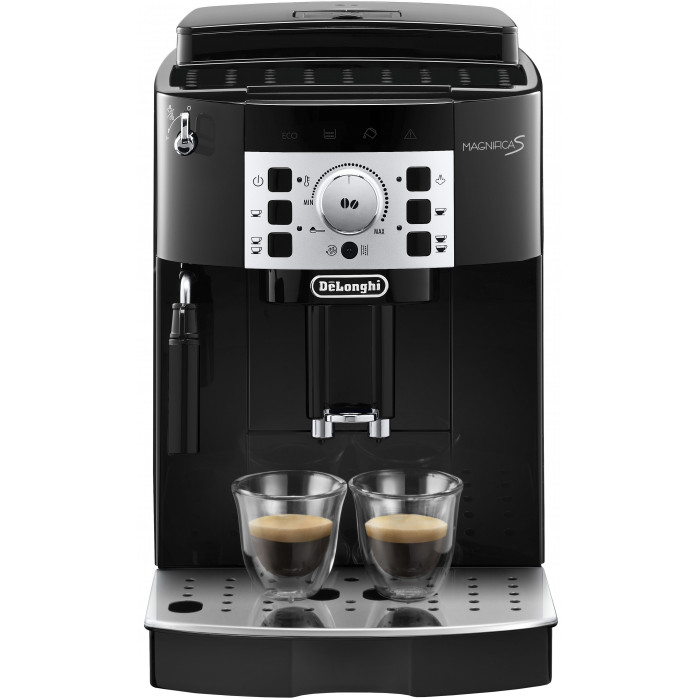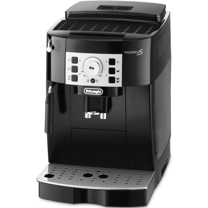 Кавомашина DeLonghi ECAM 22.112 B Magnifica S обладнана кнопковою панеллю керування. Повертанням регулятора ви можете змінити міцність кави. А натискання кнопки дає змогу вибрати порцію необхідного об'єму. Температуру води або жорсткість за своєю перевагою можна запрограмувати. Адаптер розливу кави дозволяє приготувати дві порції напою одночасно. Диспенсер для розливу регулюється по висоті. Контейнер для макухи розрахований на 14 порцій. Функція енергозбереження.