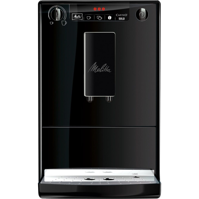Автоматична кавоварка Melitta Caffeo Solo Pure Black (E950-222 EU) чорного кольору виконана в строгому лаконічному дизайні. Вона виготовлена в настільному виконанні та готує кавові напої із зерен кави. Потужність моделі становить 1400 Вт, а тиск, що створюється, – 15 бар. Апарат обладнаний вбудованим млином з регульованим ступенем помелу та контейнером на 125 грам зерен кави. Пристрій має функцію попереднього заварювання, що дозволяє отримати максимально ароматний напій. Для цього свіжозмелена кава безпосередньо перед приготуванням змочується водою. Користувач може вибирати міцність та об'єм порції, а також підлаштовувати вихідний кран по висоті своєї чашки. Крім цього, можливе одночасне приготування двох порцій напою. Пристрій має систему самоочищення та функцію підігріву чашок. Автоматична кавоварка Melitta Caffeo Solo Pure Black (E950-222 EU) оснащена інформативним дисплеєм, на якому відображаються всі встановлені параметри.