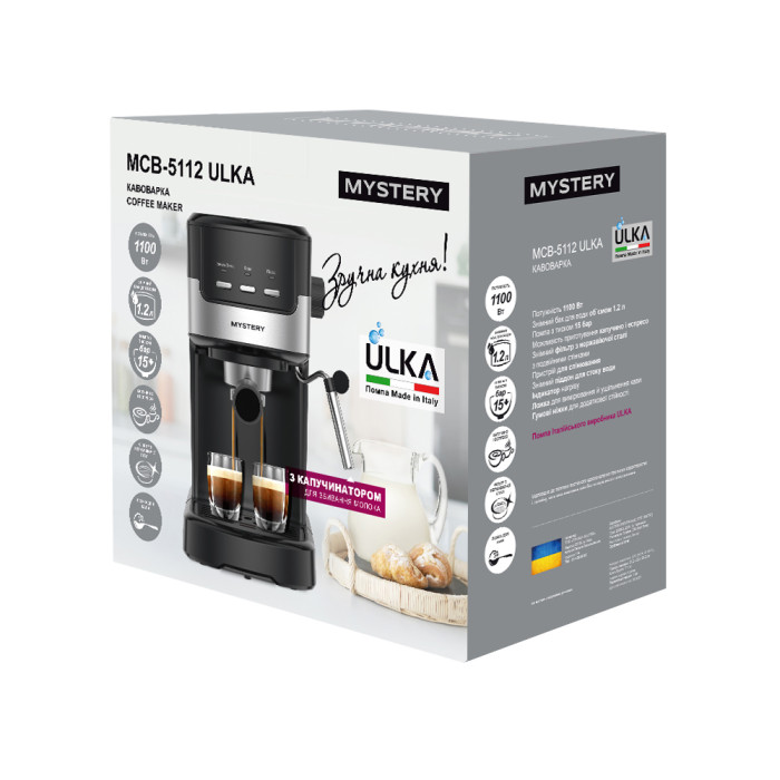 Спробуйте комфорт і легкість кавоварки MYSTERY з потужністю 1100 Вт, зі знімним баком для води об'ємом 1,2 літра і пристроєм, що спінює.Насос італійського виробника ULKA гарантує швидкість та якість приготування вашого улюбленого напою.Насолоджуйтесь витонченим ароматом еспресо, ніжністю капучіно та неповторним латте.