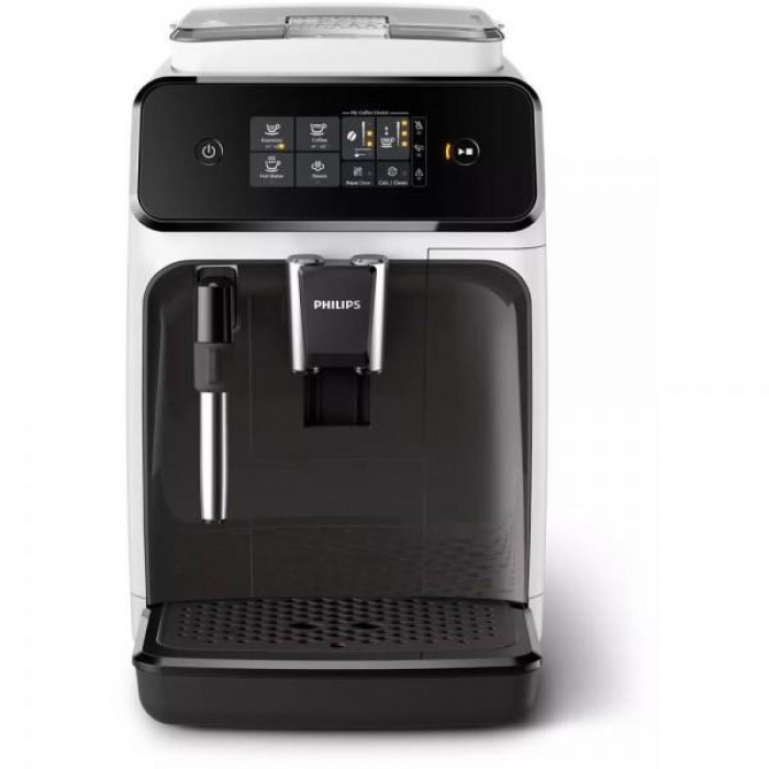 Автоматична кавомашина Philips EP1223/00 випускається в сучасному дизайні в контрастних чорному і білому кольорах. Вона виготовлена в настільному виконанні і готує напій із зерен та меленої кави. Модель потужністю 1500 Вт перетворює воду з резервуару об'ємом 1,8 літра на пару з тиском 15 бар. Для зерен є ємність на 275 грам, звідки вони безпосередньо перед приготуванням подаються на вбудований млин з керамічними жорнами, ступінь помелу в якому вибирається дванадцятьма рівнями. Напій капучино з ніжною молочною піною готується у ручному режимі. Інтелектуальна система Aroma Extract автоматично встановлює оптимальний баланс між температурою та інтенсивністю аромату кави, регулюючи при цьому кількість води. Користувач може занести в пам'ять приладу свій індивідуальний рецепт, щоб активувати його одним натисканням. Керується автоматична кавоварка Philips EP1223/00 сенсорною панеллю з інтуїтивно зрозумілими символами.