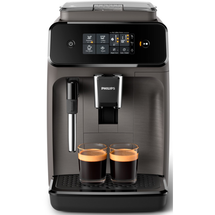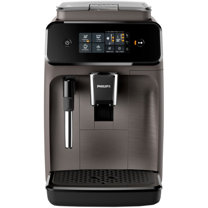 Автоматична кавоварка Philips EP2224/10 виготовлена ​​в чорному кольорі в стильному сучасному дизайні. Модель настільного виконання використовує в процесі приготування зерна кави, які подрібнюються за допомогою вбудованого млина з регульованим ступенем помелу. Щоб приготувати каву з молоком та повітряною піною, слід скористатися ручним капучинатором. На панелі керування розташований інформативний дисплей, на якому відображається весь процес приготування кави та вибираються параметри роботи. Автоматична кавоварка Philips EP2224/10 здатна одночасно приготувати дві порції кави з обраною міцністю напою та бажаного об'єму. Функція автоматичного очищення підтримує внутрішні системи приладу в гігієнічному та працездатному стані, гарантуючи тривалий термін служби.