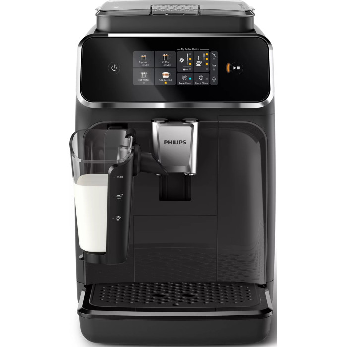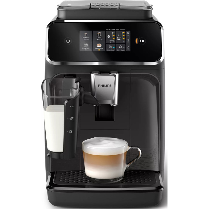 Середньобюджетна кавомашина бренду Philips - це представник однієї з базових фірмових лінійок Series 2300, але з відчутним бонусом - автоматичним капучинатором "на борту". Для приготування каво-молочних напоїв без участі користувача тут використовується система спінювання LatteGo. Вона складається з двох частин, включаючи ємність для молока на 260 мл, не має трубок, які можуть забитися, а також передбачає просту процедуру догляду, включаючи можливість розміщення посудомийної машини.