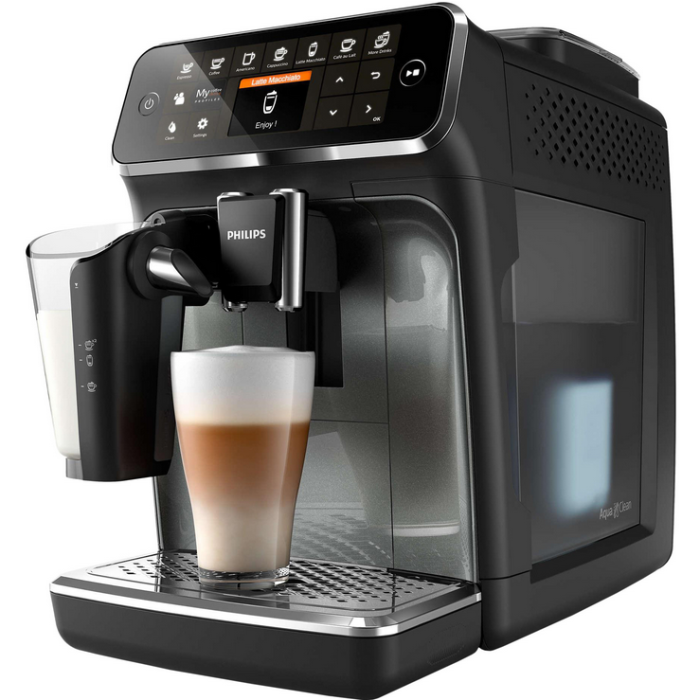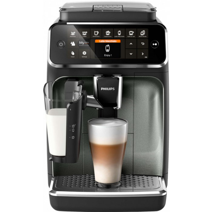 Автоматична кава машина Philips LatteGo 4300 Series EP4349/70 стильного чорного кольору виробляється в настільній конструкції. Вона готує вісім видів напоїв із зернової та меленої кави, а також виконує два запрограмовані рецепти. Модель потужністю 1500 Вт створює тиск 15 бар. Вона обладнана 1,8-літровим резервуаром для води, молочним контейнером об'ємом 0,265 літра та герметичною ємністю, розрахованою на 275 грам зерен. Ступінь помелу вбудованого млина з керамічними жорнами регулюється 12 рівнями. Капучинатор LatteGo створює ніжну піну, яку потім подає у чашку. Приготування кавових напоїв контролюється інтелектуальною системою Aroma Extract, щоб забезпечити оптимальний баланс між температурою нагріву та швидкістю подачі води. Користувач може задавати 5 ступенів міцності та об'єм порції кави. Автоматична кавомашина Philips LatteGo 4300 Series EP4349/70 легко обслуговується та підтримується в чистоті - її варильна система очищається під струменем води, а знімні деталі та частини можна мити у посудомийній машині.