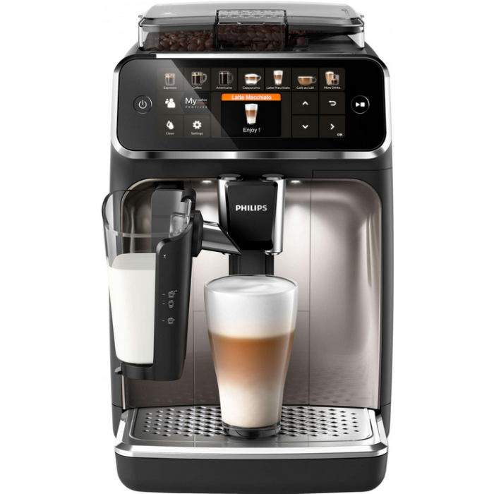 Автоматична кавомашина Philips LatteGo 5400 Series EP5447/90 виготовляється в настільному виконанні в стильному чорному корпусі з хромованою панеллю управління. Модель елегантного сучасного дизайну гармонійно виглядатиме в будь-якому кухонному інтер'єрі. Апарат готує 12 видів напоїв із зернової та меленої кави, у тому числі капучіно за допомогою системи LatteGo, що подає ніжну молочну піну прямо в чашку. Крім того, користувач може запрограмувати 4 індивідуальні рецепти, а також вибирати 5 рівнів міцності та об'єм порції кави. Вбудований млин з керамічними жорнами функціонує з 12 ступенями помелу. Технологія Aroma Extract оптимізує температуру та швидкість потоку води, щоб досягти максимального аромату напою. Автоматична кавомашина Philips LatteGo 5400 Series EP5447/90 зручна в обслуговуванні – її варильну систему можна мити під струменем води, а знімні частини – у посудомийній машині.