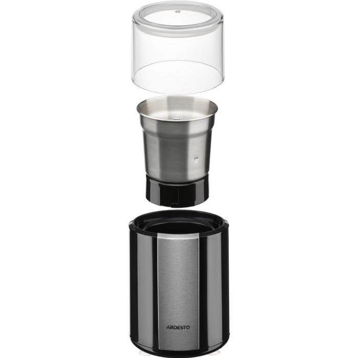 Корпус кавомолки виконаний із міцного матового чорного пластику та вставок із шліфованого металу. Прозора кришка з прогумованим ущільнювачем дозволяє контролювати процес роботи, а знімний сталевий контейнер на 60 г – простий доступ до подрібнених продуктів та легке очищення.
