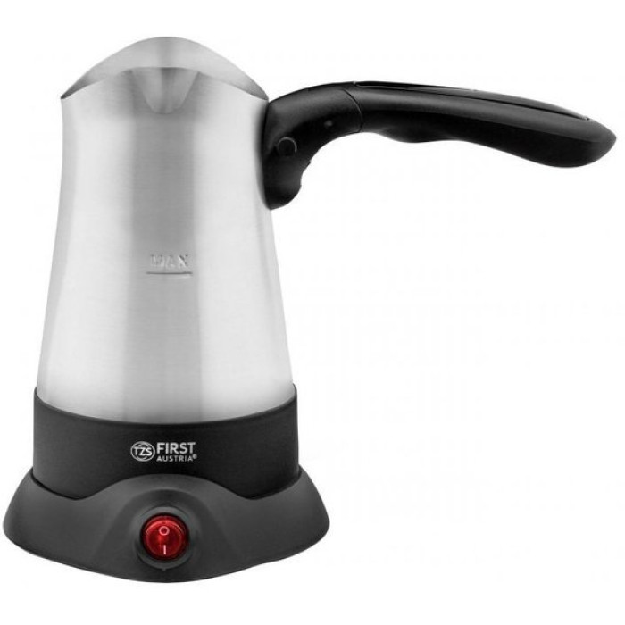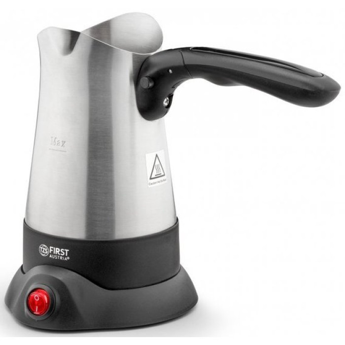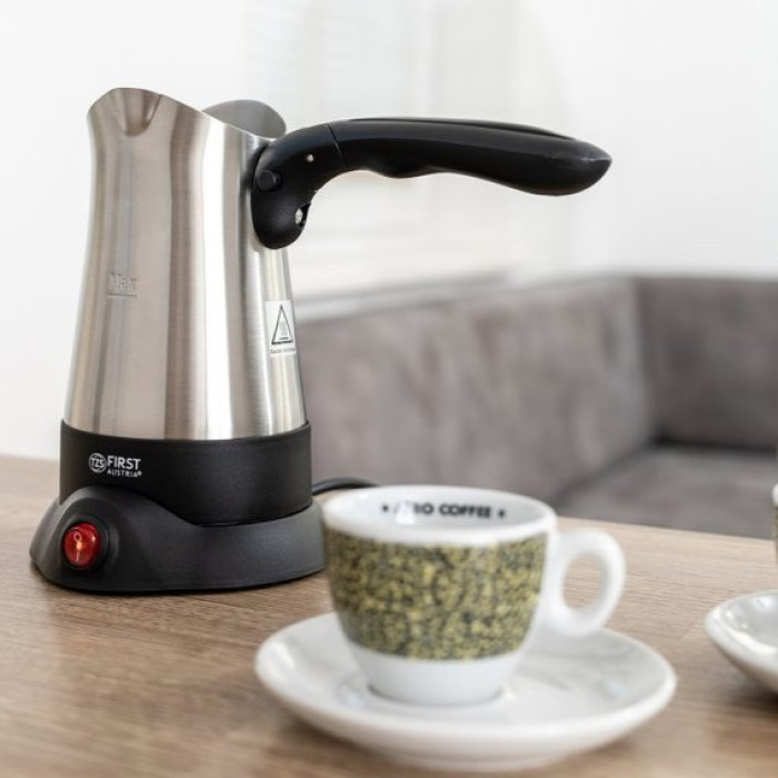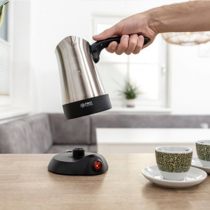 Електрична турка First миттєво приготує міцне мокко, каву або еспресо на сніданок. Професійний прилад переконує своїм класичним виглядом із нержавіючої сталі та витонченим дизайном, який підходить будь-якій кухні. Завдяки потужності 800 Вт кавоварка закип'ятить до 2 чашок кави, води чи молока в ємності об'ємом 0.35 л. Процедура дуже проста: налийте мокко та воду і доведіть до кипіння.