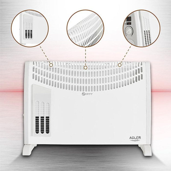 Електричний конвектор Adler AD-7705 із ступінчастим регулятором потужності та пасивними опорами. Конвектор працює за принципом природної конвекції повітря та рівномірного розподілу тепла з максимальним комфортом та швидкістю. Електроконвектор призначений для встановлення у житлових приміщеннях. Ця температура підтримується за допомогою вбудованого електромеханічного термостата. Установка на підлозі (основний варіант експлуатації). Характеристики: Тип: конвектор Нагрівальний елемент: ститч-нагрівач Джерело живлення: електромережа Максимальна потужність: 2000 Вт Максимальна площа обігріву: 20 м² Функції: термостат; регулювання температури; захист від перегріву. Установка (монтаж): підлоговий Габарити: 71 х 15 х 46 см Колір: білий з чорним Виробник Adler