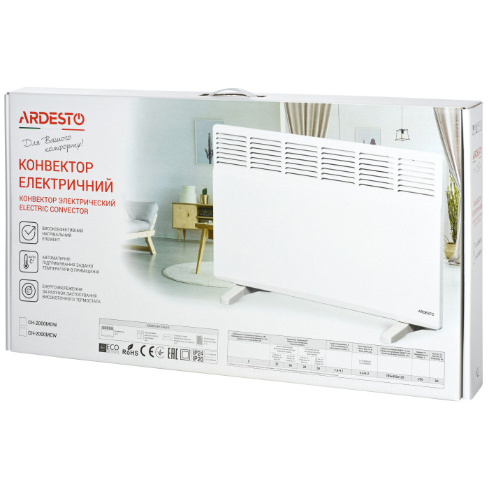 Електричний конвектор з механічним керуванням, класом захисту IP24 та потужністю 2000 Вт. Розрахований на обігрів 20 м2. Конвектори Ardesto підтримують два типи монтажу – настінний та підлоговий. Кронштейни та опори постачаються в комплекті з обігрівачем.